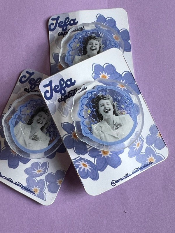 Prendedor Evita, para llevar a la jefa espiritual a todos lados, 3cm, acrílico transparente con glitter